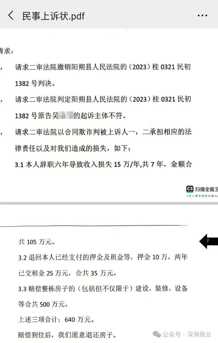 2023年6月,潘先生将陈某升起诉至阳朔县法院。但陈某升反而向潘先生索赔640万元,其中包括辞职六年损失、已支付的租金和押金、整栋房屋的装修等费用,称赔偿到位后才会把房子退给村民。