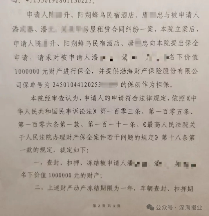2025年8月,陈某升、阳朔蜂鸟民宿酒店经营者唐某忠向阳朔县法院提出保全申请,请求对潘先生及家人名下价值100万元财产进行保全。并提供渤海财产保险股份公司的保函作为担保。