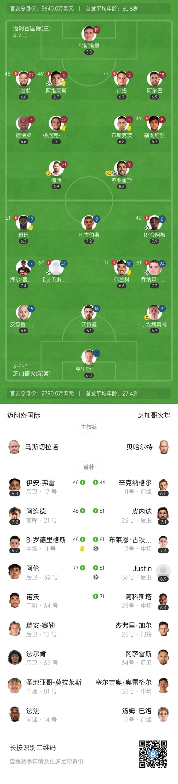 下半场补时6分钟,迈阿密国际3-5芝加哥火焰。